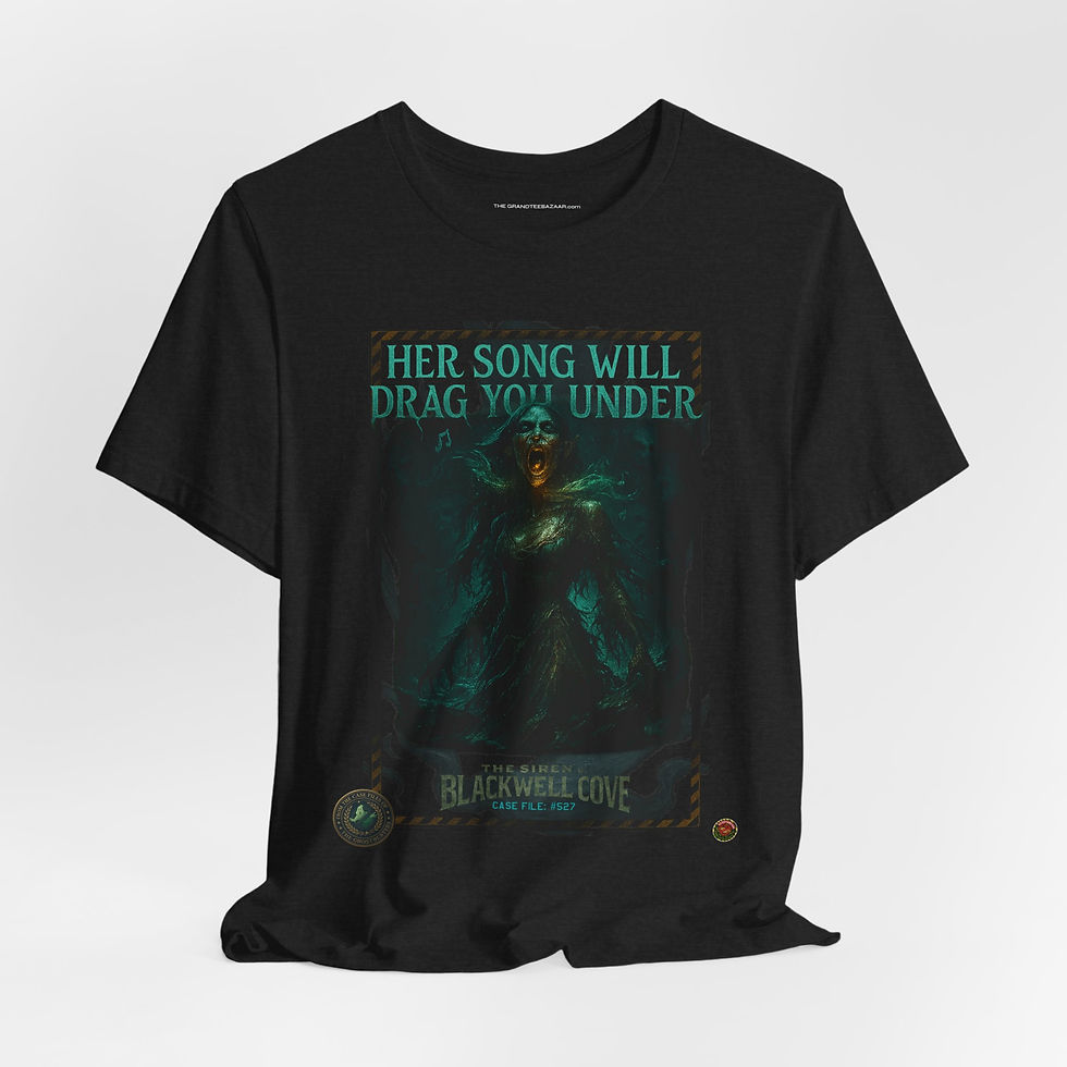 The Siren of Blackwell Cove manifests as a striking, ghostly woman from the waist up, her lower body fading into a coiling mass of mist, seawater, and spectral feathers. She radiates an almost hypnotic beauty, but her features shift subtly — one moment alluring, the next revealing a gaunt, predatory visage. Her skin glistens as if perpetually wet, hair drifting as if underwater, and eyes shimmering with bioluminescent blue light. When agitated, her hands elongate into talons tipped with corroded, salt-crusted claws.